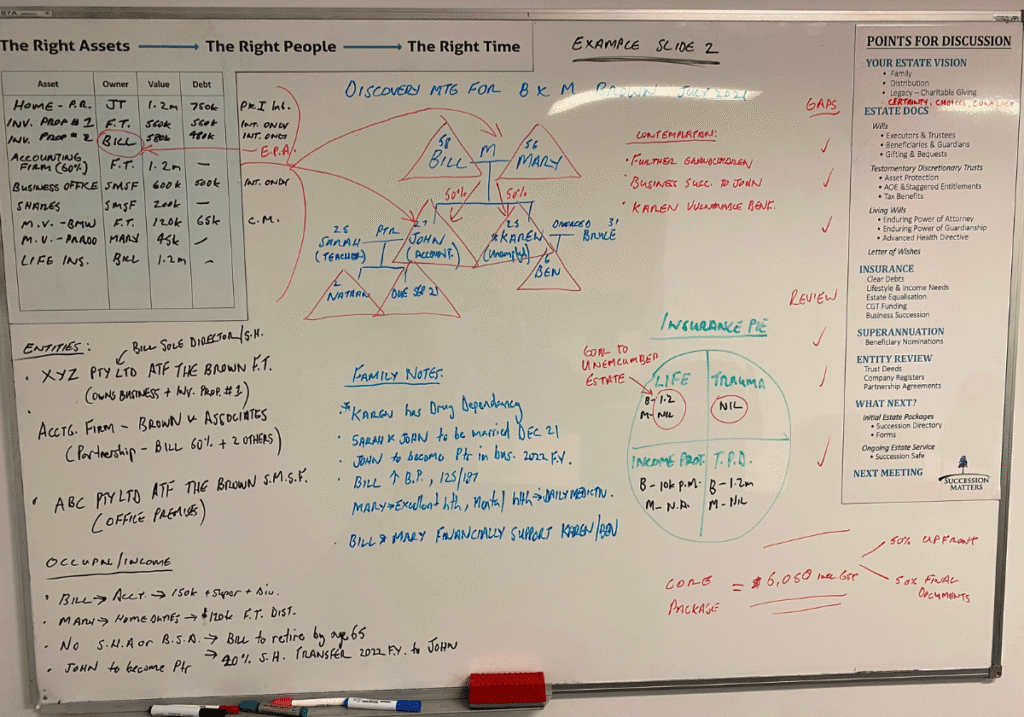 One of the most effective ways to start these conversations is through a Discovery Meeting. Often done around a whiteboard, it allows families to see their world – relationships, assets, and obligations – mapped out clearly. This helps identify gaps, align intentions, and spark real conversations about what matters most.